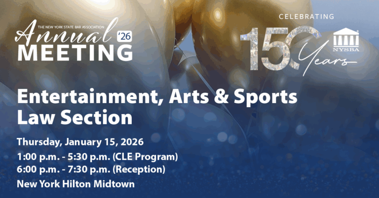 The Entertainment, Arts & Sports Law Section has been in the forefront of introducing, monitoring and evaluating legal developments in the areas of entertainment, art and sports law at both federal and New York State levels.