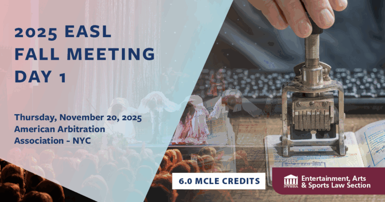 Join us this November for the 2025 EASL Fall Meeting, a premier two-day event bringing together legal and business professionals across the entertainment, arts, and sports sectors. This year’s program offers a dynamic blend of CLE and CPE-accredited sessions, timely panel discussions, and valuable networking opportunities.